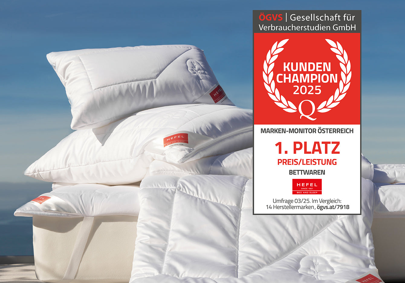 Damit tragen wir auch 2025 stolz das Gütesiegel „HEFEL Kunden Champion“. Diese erneute Auszeichnung bestätigt unseren Anspruch, höchste Qualität und besten Schlafkomfort zu einem fairen Preis zu bieten. Wir sind stolz, dass unsere Kundinnen und Kunden uns auch dieses Jahr wieder ihr Vertrauen geschenkt haben.